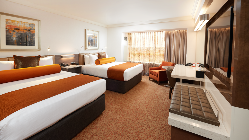 With two queen beds or one supreme king, this room abounds with classic touches in two contemporary styles. With amenities like crisp linens, allergen-free pillows, the sleek design of granite vanities and an oversized shower, a Classic Room is the perfect Vegas-y balance of fun and refined.